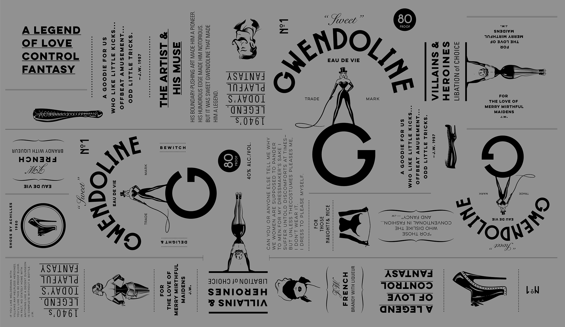 Brands are stories and Sweet Gwendoline is no different. A love story that began when John Willie moved from Australia to Canada in the early 1940's. He settled in the red light district area and was known to spend many hours witnessing a dance act by a beautiful woman who ended her act by thanking the crowd with a red libation. One evening Gwendoline did not show up, and John Willie desperately searched for her up and down the East Coast before making New York his home. This was the beginning of the Adventures of Sweet Gwendoline.