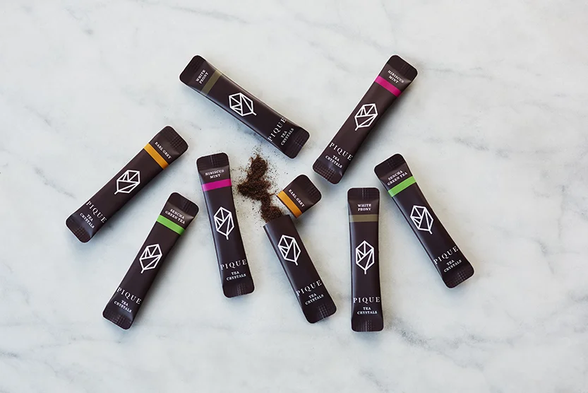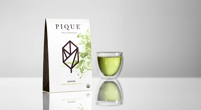 Pique tea does all that and more. It captures all the goodness of organic tea, into fine crystals which dissolve in a matter of seconds. The brand, informed by the idea of "Moments of Now", displays a multi faceted tea-leaf to visually represent the process of turning leaves into crystals and a look and feel that captures the magic in the water.